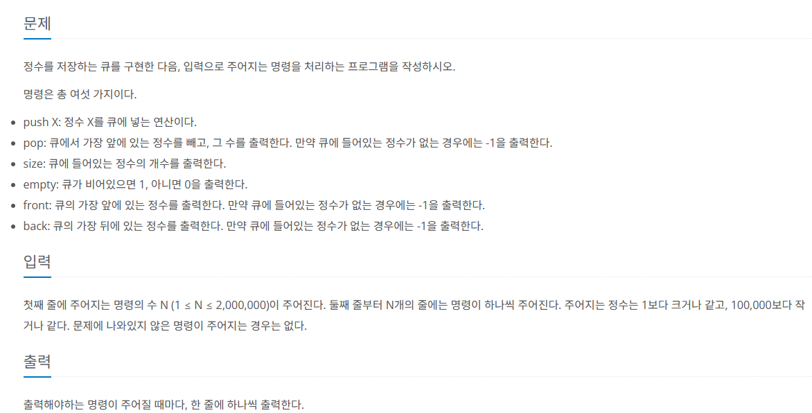 18258번: 큐 2 첫째 줄에 주어지는 명령의 수 N (1 ≤ N ≤ 2,000,000)이 주어진다. 둘째 줄부터 N개의 줄에는 명령이 하나씩 주어진다. 주어지는 정수는 1보다 크거나 같고, 100,000보다 작거나 같다. 문제